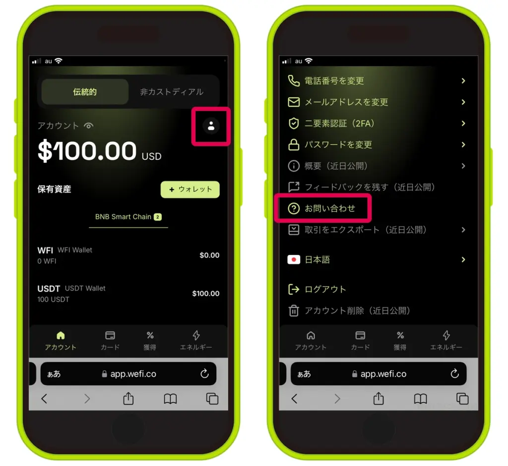 WeFiを利用する上で何か困ったことがあれば、WeFiアプリ内の「お問い合わせ」から公式サポートへ問い合わせをすることもできます。