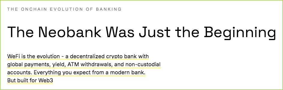 「WeFiはグローバル決済、利回り、ATM引き出し、非カストディアル口座など従来の銀行に期待されるあらゆる機能を備えている分散型暗号資産銀行です。しかもWeb3で構築されています。」