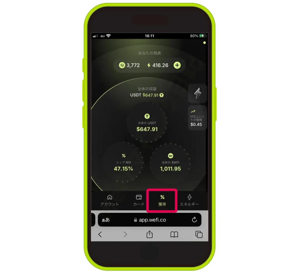 ITOユニットを購入するとWFIトークンをマイニングできるので、その状況が表示されています。(ITOユニットやネイティブトークンのWFIは後述します。)
